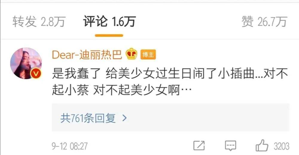 迪丽热巴很快也在评论区看到留言并意识到了自己的错误,于是第一时间把配图编辑替换了,并在评论区向蔡徐坤和杨幂表达了歉意:“是我蠢了,给美女过生日闹了小插曲,对不起小蔡,对不起美少女啊。”