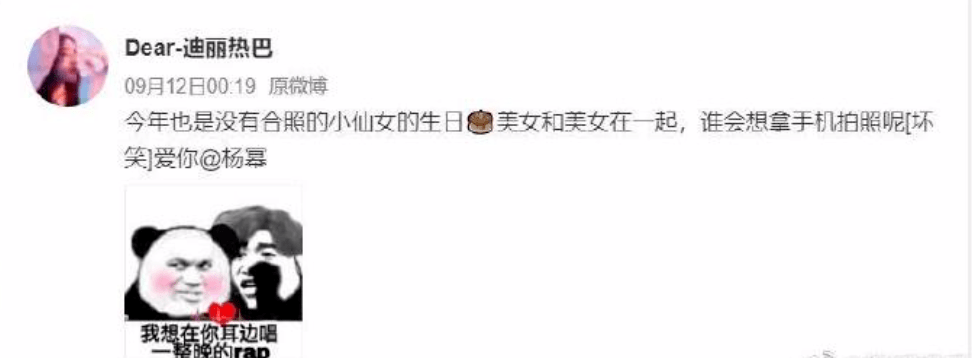 迪丽热巴在凌晨为杨幂庆生并配文:“今年也是没有合照的小仙女的生日,美女和美女在一起,谁会想拿手机拍照呢?爱你 。”