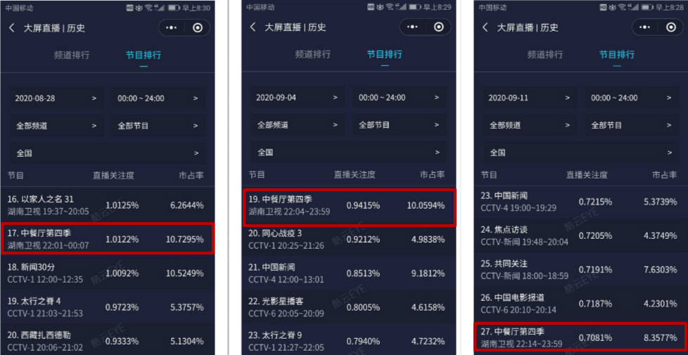 根据酷云收视率的历史数据来看,8月28日,《中餐厅》收视率1.0122%,全国排名第17位。9月4日,《中餐厅》彩虹气象开始逐渐浓厚,而收视率下降到了0.9415%,全国排名则下跌到了第19名。9月12日,《中餐厅》可谓是彩虹气质到了极点,而这一期的平均收视率则只有0.7081%,全国排名下降到了第27位。