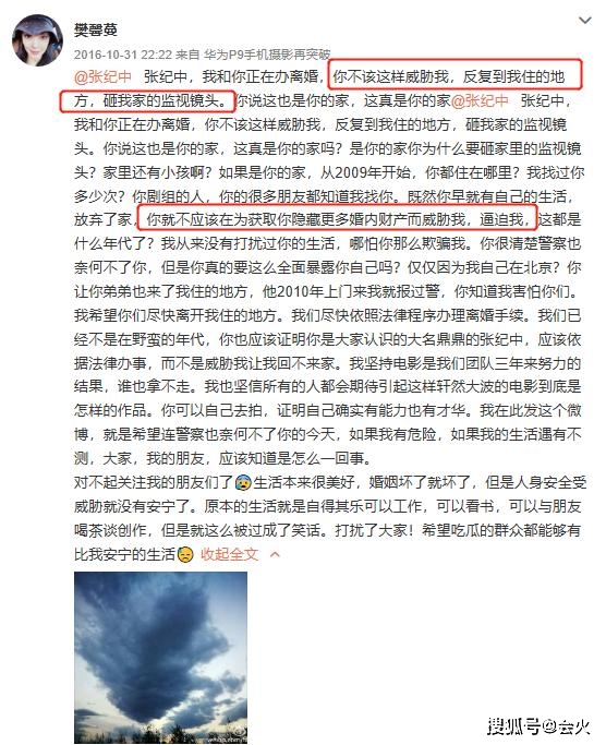 两个月后,樊馨蔓发文表示正在和张纪中办理离婚,同时她称受到了张纪中的威胁,家中的监视镜头被张纪中砸了。
