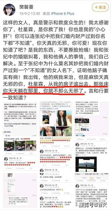 和张纪中彻底撕破脸之后,樊馨蔓甚至直接喊话杜星霖,称张纪中把婚内财产过给了杜星霖。樊馨蔓还让杜星霖滚出自己的房子,还表示:"你躺在我的床上就不那么无邪了。"标准的原配手撕小三戏码。