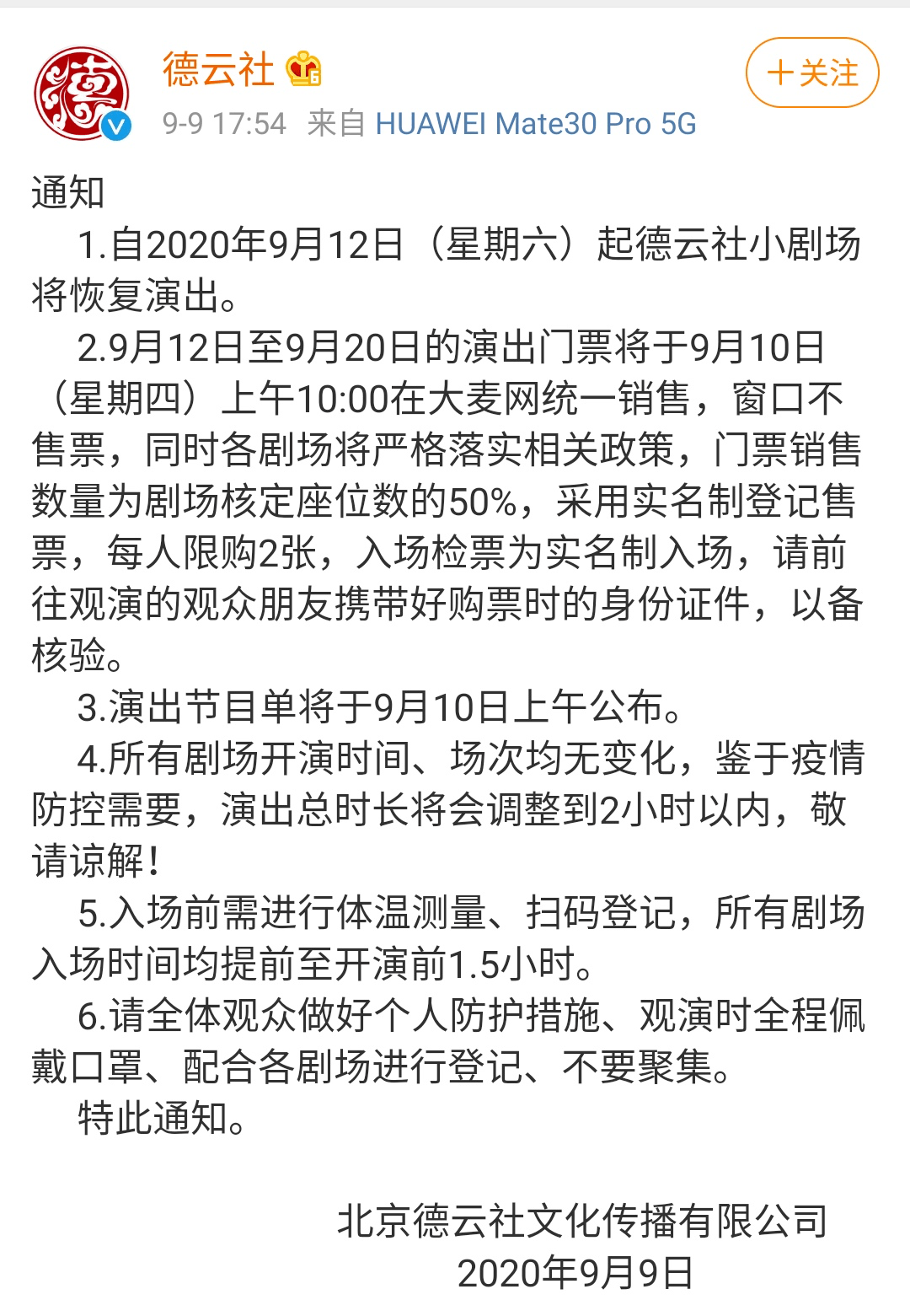 9月9日,德云社官方微博发布公告正式宣布德云社小剧场将在9月10日开启线上售票,9月12日恢复演出。而在开启预售的一刻,所有票源瞬间销售一空。这种现象,在此前已经发生过多次。