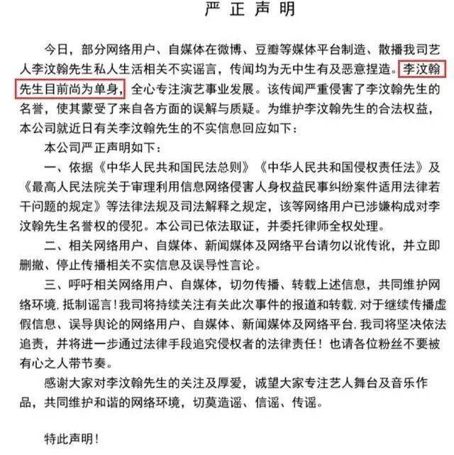 对于以上巧合,李汶翰所在的公司矢口否认,还义正言辞的发表了声明,表示李汶翰是单身。