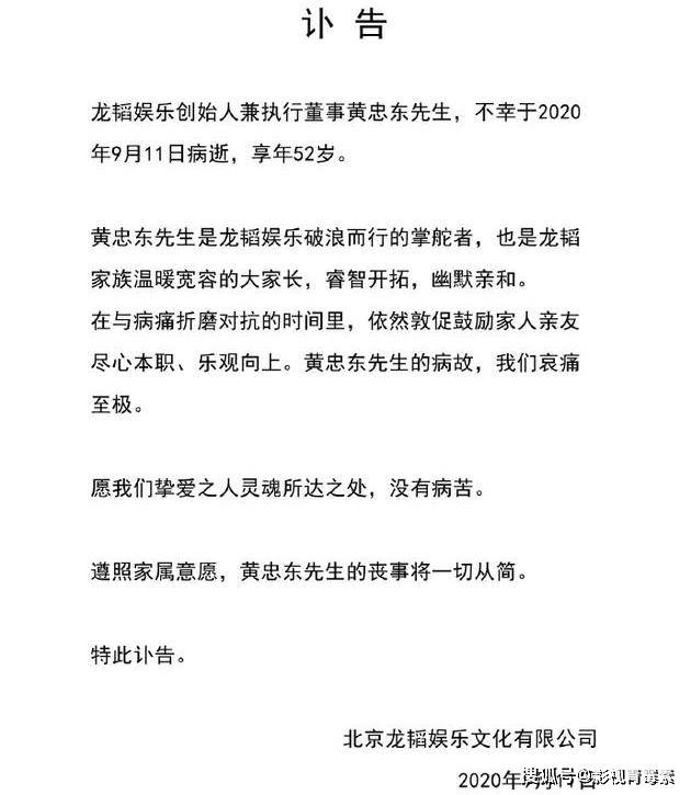 序言:2020年9月11日,黄子韬的父亲、龙韬娱乐创始人兼执行董事黄忠东病逝,享年52岁。龙韬娱乐发讣告悼念,黄子韬工作室转发悼念,而黄子韬本人则没有发声,此时应该很伤心吧。