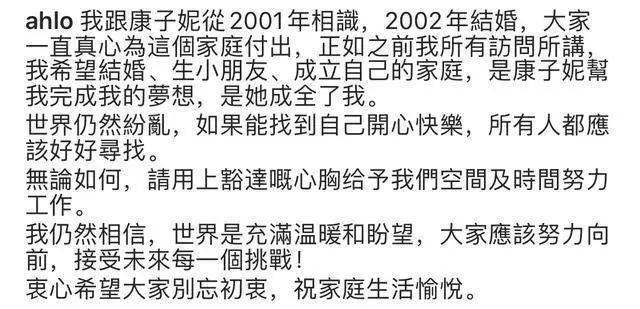 虽然看起来是对离婚的回应,但阿Lo全文中都没有提到离婚,反而一直在称赞康子妮,说她“帮我完成我的梦想”、“一直真心为这个家庭付出”,还希望大家给予他们空间和时间努力工作,处处维护前妻。