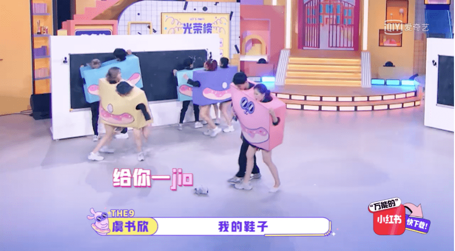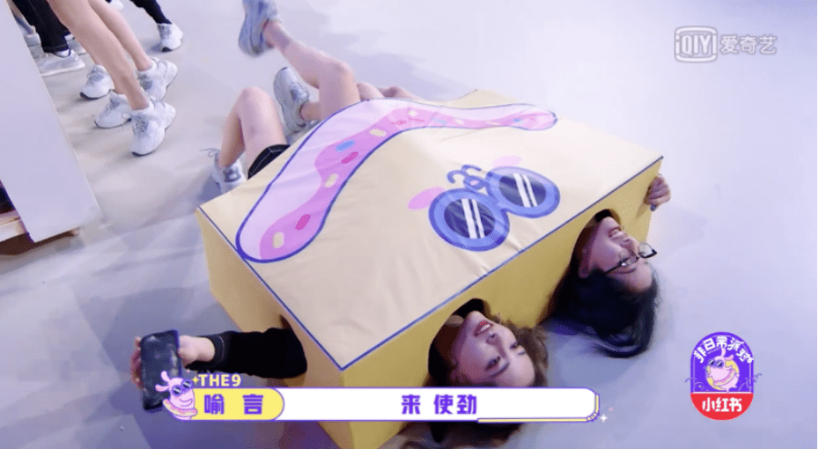 虞书欣的头被卡在箱中,鞋子也飞了。