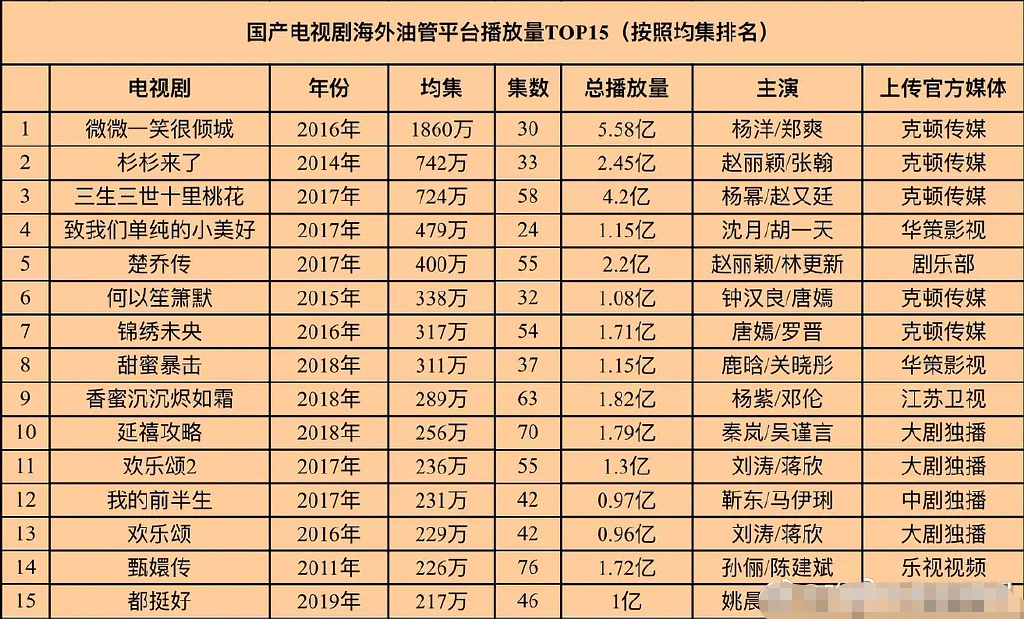 其次,从演员来看的话,就如前文所说,杨洋和郑爽排名第一,证明他们在海外很大影响力,另外赵丽颖、刘涛都有两部作品上榜,称得上是电视剧领域一线女演员了。
