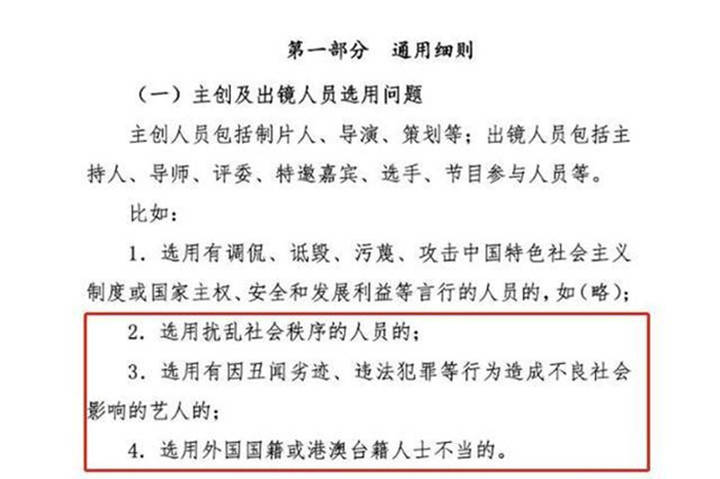 要知道“限籍令”限制的不仅仅是外籍明星,还包含了对劣迹艺人的限制,对于一些扰乱社会秩序不当的;有丑闻劣迹、违法犯罪等行为造成不良社会影响的艺人,同样要限制其部分资源并谨慎选用。