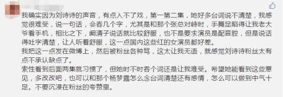 可是这一次,刘诗诗居然少有的用了自己的原声出演。很多观众对龙葵、若曦的声音已经很熟悉了,反而当刘诗诗用她自己的声音时,会让人感到陌生。加上她的台词功底并不是那么好,吐字不清、漏字吞字的情况常有,所以当观众看到刘诗诗这次的表演时,从头到尾的感觉是不太流畅的。