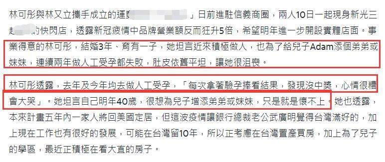 此次在活动现场,林可彤坦言去年及今年一直在积极做人工受孕,也是为了给儿子Adam添个弟弟或妹妹,明年的她就满40岁了,很想再有一个孩子,就是怀不上,让她很沮丧。