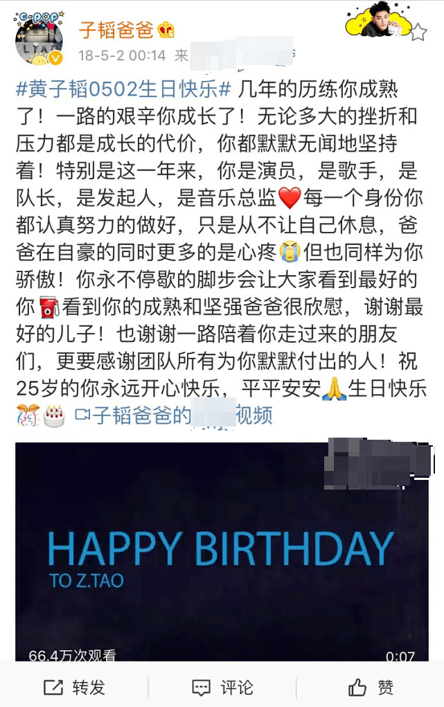 2019年,黄子韬爸爸又给他发了一大段生日祝福文,让粉丝更了解黄子韬不为人知的一面。原来看似吊儿郎当、大大咧咧的黄子韬也会如此感性。