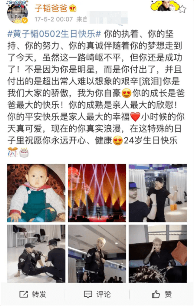 翻看黄子韬爸爸的微博,不难发现每到5月2日这个特殊日子,他总是风雨不改为儿子写上真挚的生日祝福。或许对于他而言,黄子韬是他此生最大的骄傲。2017年,黄子韬爸爸曾夸赞黄子韬:“小时候的你天真可爱,现在的你真实浪漫。”可见,不论是哪个阶段,黄子韬爸爸永远都觉得儿子是最好的。