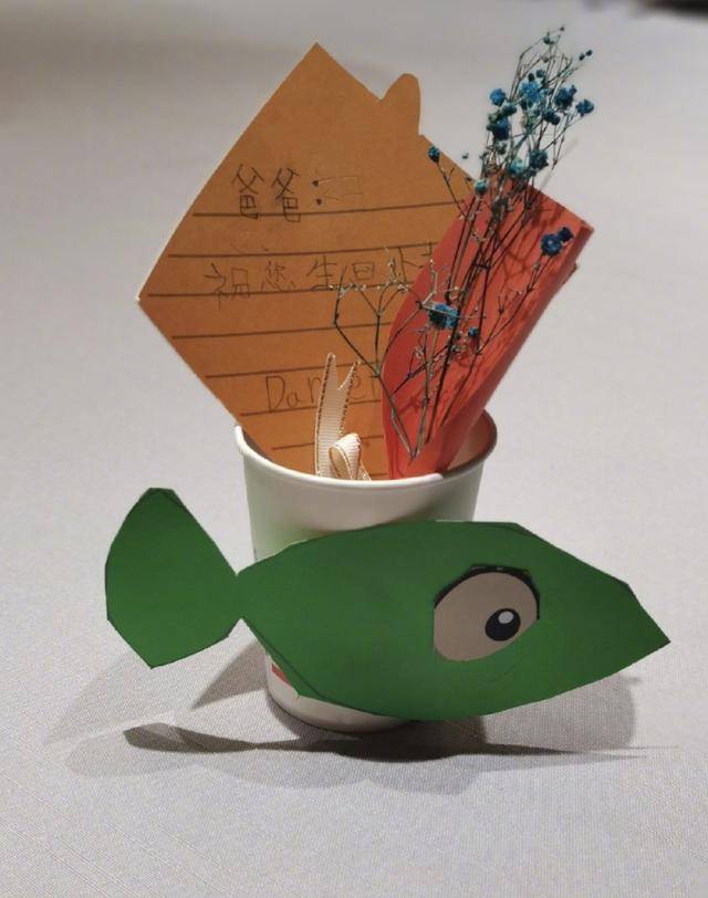 虽然自己是意外,但嗯哼还是非常贴心地为爸爸准备了小礼物。卡片上写着“爸爸祝您生日快乐”,署名则是“Daniel”。还附上一条小鱼和一束超迷你的满天星。