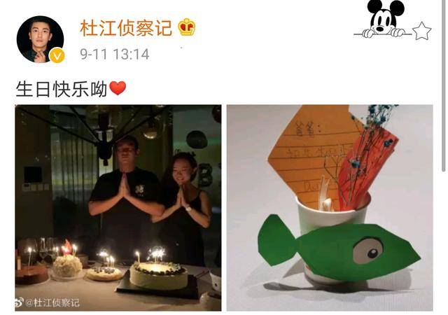9月10日是杜江的35岁生日,第二天他才分享了自己前一天晚上庆生的画面,以及嗯哼送给自己的礼物,并附文:生日快乐。三颗爱心代表一家三口幸福温馨。