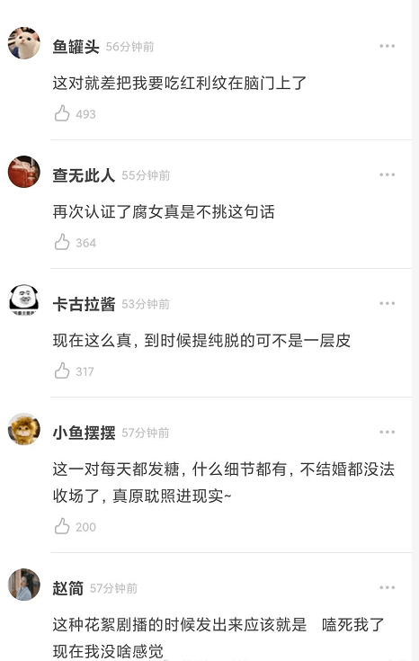 看到罗云熙与陈飞宇的甜蜜互动,网友们纷纷留言表示“这对就差把我要吃红利纹在脑门上了”、“现在这么真,到时候提纯脱的可不是一层皮”、“这一对这么真,每天都在发糖,不结婚都没法收场了”。