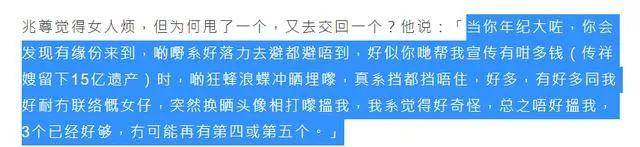 但细想一下,老大老二能跟在邓兆尊身边超过20年,也证明她们有一定的忍耐能力的,加上邓兆尊曾经讲过,因为母亲留下15亿遗产,他根本不缺女友,踢走一个马上就有新的女友上位。他一直以来只有三位女友是因为他自己觉得三个已经足够,多了会变得麻烦,这或者也是邓兆尊能如此肆无忌惮独宠新老三的原因吧。