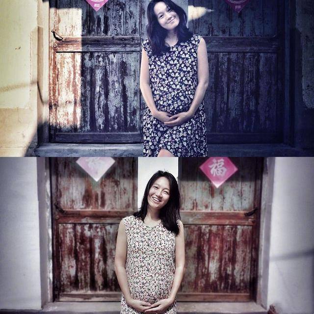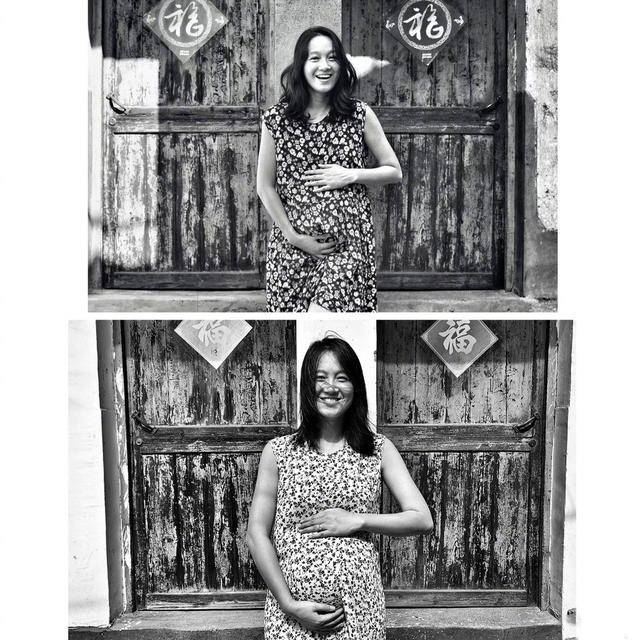 上面是三年前的旧照,下面是现在的样子。目测朱丹应该是回老家了,背景都是斑驳的木门,唯一变化的是“福”字换新的了。朱丹穿着相似的无袖碎花裙,披散着长发,而且都是素颜,她双手捧着孕肚,脸上写满了幸福,不过发型稍显不同,显然现在比之前美,论发际线的重要性。