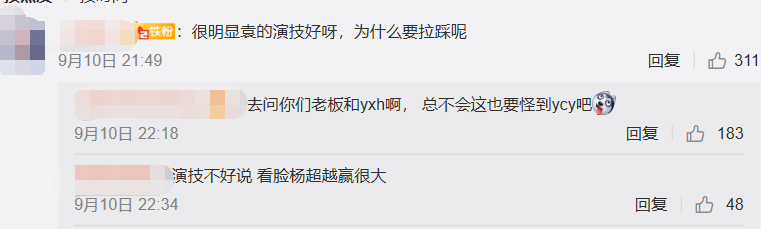 不过还是有理智的网友指责姜磊带节奏,跟于正的骚操作有得一拼,而且这波拉踩太迷了,袁冰妍的影视约是签在欢瑞旗下的,也算半个欢瑞艺人,而杨超越是传递娱乐旗下的,这是胳膊肘往外拐踩自家艺人来宣传新剧吗?袁冰妍也是有点惨啊。