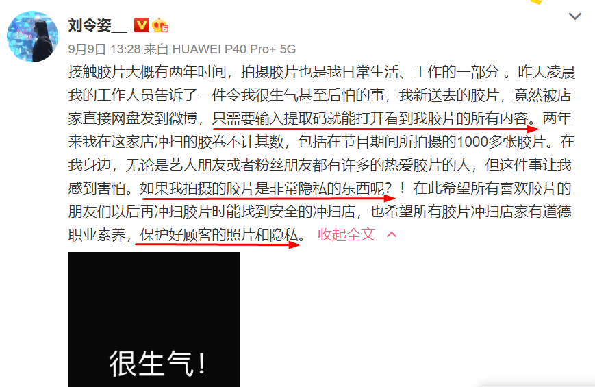 刘令姿接触胶片已经两年多了,单在节目期间就拍摄了1000多张。最近发生了一件让她特别生气的事情,她经常冲扫胶卷的店铺把她胶片里的所有内容发到了微博上。如果是别人非常隐私的照片呢?她呼吁店家要有职业素养,保护好顾客隐私。