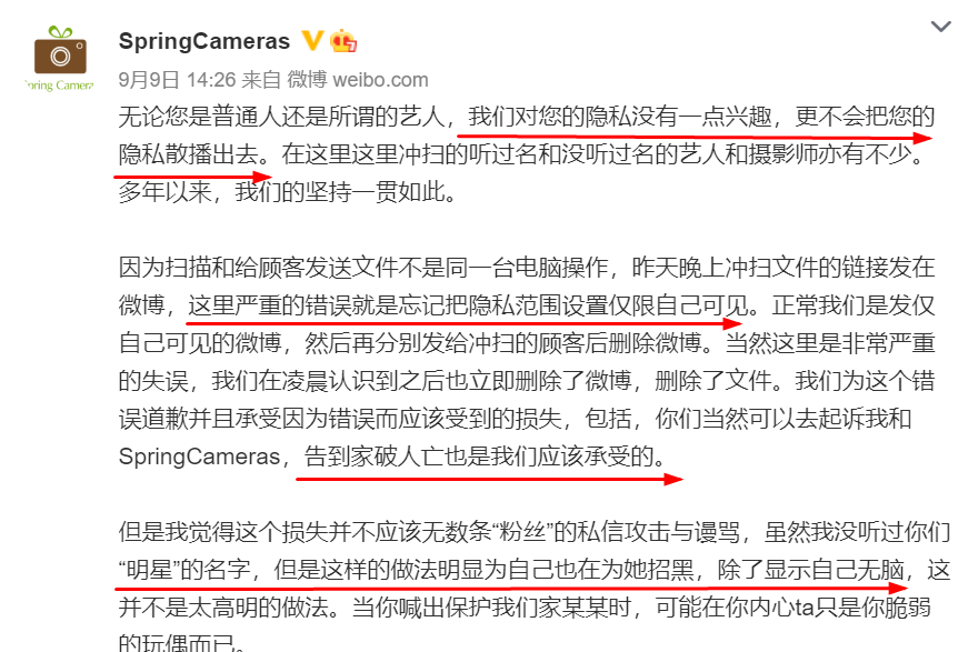 你现在要做的,就是首先真诚道歉,接着解释自己为什么会这么做。既然这次会有失误,为了避免以后出现失误,下次就不通过微博,改为更为隐秘和安全的沟通方式。他自己也说了,还有很多知名人士在自家扫照片,那就更应该注意隐私保护了。最后再次表达自己的歉意,并做出一些实际上的弥补错失。这才是正确的逻辑才对吧?