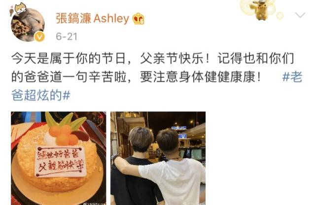 在今年6月父亲节,张镐濂于社交网秀出与张丹峰搭肩的背影照,发文祝他父亲节快乐,还送上写着“绝世好爸爸”的蛋糕。
