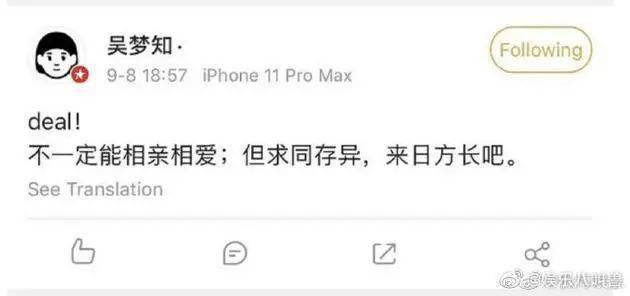 近日,有网友发现《乘风破浪的姐姐》导演吴梦知昨天下午发微博感慨:“不一定能相亲相爱,但求同存异,来日方长吧。”