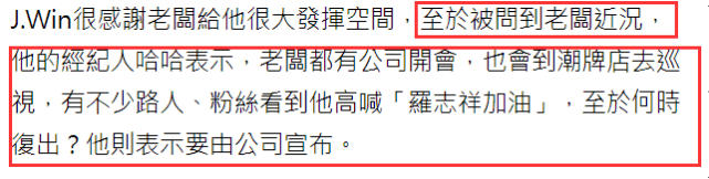 李振纬非常真诚地表达了对罗志祥的谢意,感谢罗志祥给了他很大的发挥空间,至于被问到罗志祥的近况时,李振纬的经纪人哈哈则透露:“老板都有到公司开会,也会到潮牌店去巡视,有不少路人或者粉丝看到他都会高喊‘罗志祥加油’!”关于罗志祥具体的复出时间,经纪人只回答要由公司宣布。
