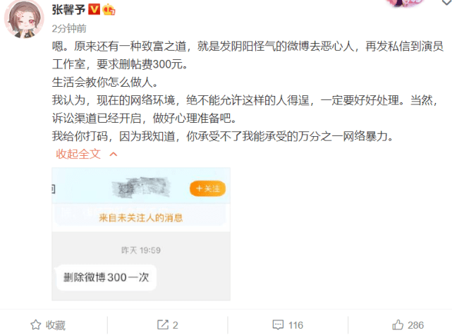 张馨予晒出了该大V敲诈自己的截图,截图中该大V表示:“删除微博300一次。”很显然就是在威胁张馨予。对此张馨予态度非常强硬,她说道:“我给你打码,因为我知道,你承受不了我能承受的万分之一网络暴力。”