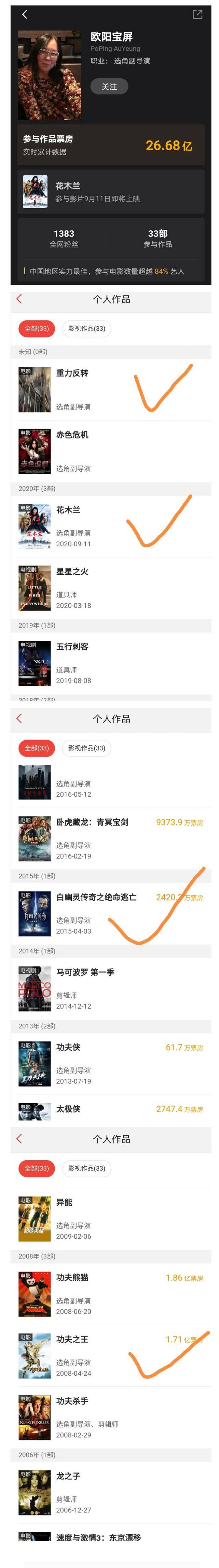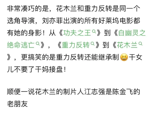 值得一提的是,不论是《重力反转》还是《花木兰》,选角导演都为同一人欧阳宝屏。追溯刘亦菲早年参演的中美合作大片《功夫之王》、《白幽灵之绝命逃亡》,都能看到欧阳宝屏的身影。