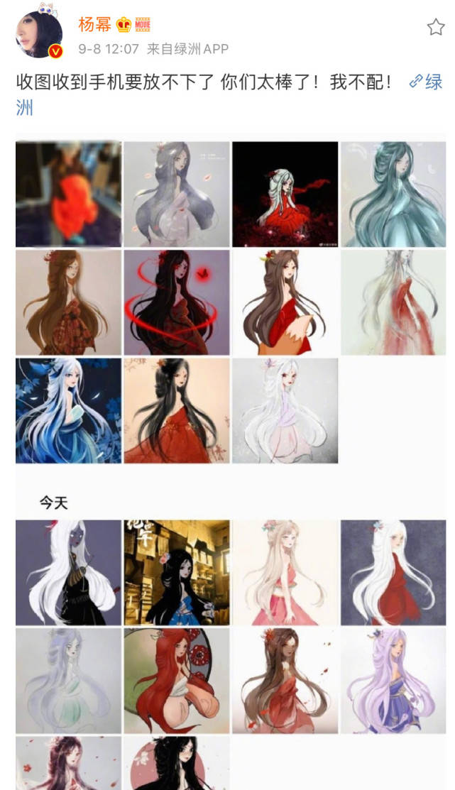 前两天杨幂也是在自己的微博社交账号上发布了一张自己手绘的漫画,但是这张漫画是没有填色的,杨幂也是邀请自己的粉丝朋友们为这一张画稿填色。而今天杨幂也再一次发布微博声称粉丝朋友们的填色真的是太棒了,自己收藏了一些粉丝朋友们的填色图片,手机内存已经快要撑不住了。从图片中我们也可以看到粉丝朋友们真的是非常的厉害,为这一张图片填了非常多的色彩。