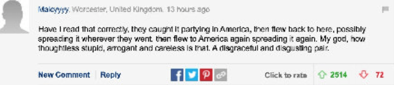 但是!英国网友目前正在集体攻击他们一家人,因为他们隐瞒了病情,网友写道:“一直在到处旅行,现在爆料出来?让人震惊,他们在美国、意大利、英国转来转去”,“他们如果是在美国确诊的,就呆在那里,现在依然环球旅行,哪怕是坐着私人飞机与头等舱,依然会接触其他人。”“这些人根本就不关心其他人”……还有网友认为这就是炒作:“3月的事9月曝光,这两人是分开过的,一代镁光灯就聚在一起吧。”“谁在乎呢?我不信,他们只是在求关注罢了。”