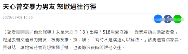 由于活动的主题是关于“守护受暴妇幼”的,天心一开始就坦言自己曾经交往过很暴力的男友,自己被对方推、挤,天心想到这些事情就感叹道:“有时不是沟通就可以解决问题的。”她表示对方还会踢家具、丢杂志,气得她当时都想摔手机,天心称非常后悔浪费时间跟他交往。碰到这样的渣男无疑是不幸的,但还好天心及时逃脱了,