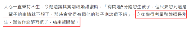 关于生孩子,天心一直都是秉持着拒绝生育的态度,如今天心已经45岁了,她仍然坚持不生育。天心表示其实刚结婚恩爱时,自己有闪过5分钟想生孩子的念头,但只要想到这是一辈子的事情就又不想要孩子了,只是在那一瞬间会觉得有个孩子应该还不错。经过认真考虑后还是打算不生,她透露自己还曾做噩梦怀孕了,结果被吓醒。