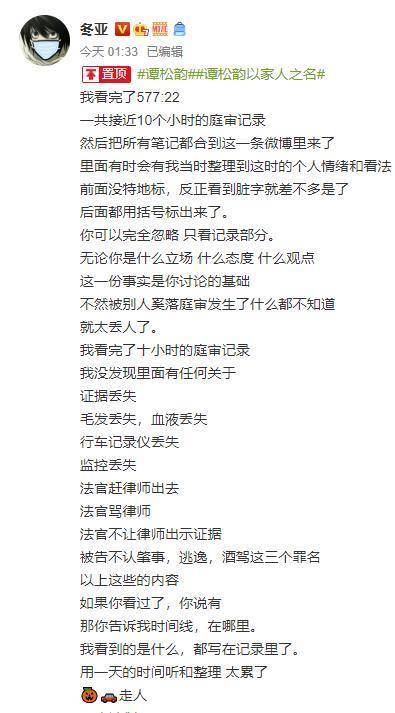 或是关心则乱,谭松韵的后援会发表动态对"证据丢失、法官不让律师出示证据、被告不认逃逸肇事酒驾这三个罪名"等多个环节提出疑问。