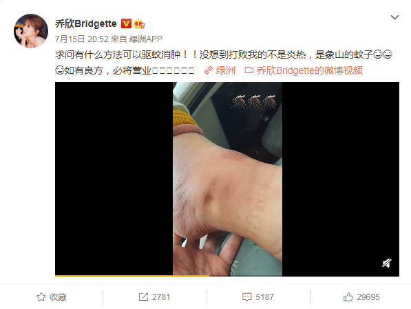 前段时间更在社交网站上更新在象山拍戏的近况,晒出被象山蚊子叮咬而肿胀的右脚脚腕,向广大网友求助驱蚊消肿小诀窍。炎炎夏日拍古装戏真是不容易,这次乔欣担任大女主是否能hold住呢?我们拭目以待。