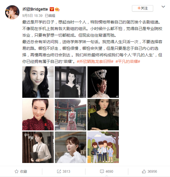 9月5日,乔欣在自己的社交平台上面更新了一则动态,正文中乔欣这样写道:“想起当时自己一个人,特别楞地带着自己的简历挨个剧组投递,小时候什么都不怕,认为有梦想一切都能成,但现实往往背道而驰。送给学弟学妹一句话:人生只活一次,不要选择容易的路,要忠于自己内心的选择,再慢再难也终归会达到,你会拥有属于你的荣耀。”并晒出了一组自己在跑龙套时期的旧照,勉励学弟学妹同时宣传新剧《平凡的荣耀》。