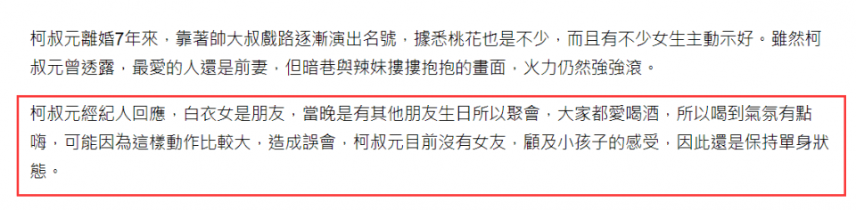 面对此次的绯闻,柯叔元经纪人回应:“白衣女子是朋友,当晚是有其他朋友生日所以有的聚会,大家都爱喝酒,喝到气氛有点嗨,可能因为动作比较大,造成误会,柯叔元目前没有女友,顾及孩子的感受,所以一直保持单身。”