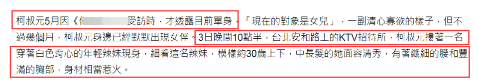据报道中介绍,两人在KTV待了42分钟后,牵手漫步在东区街头,一路走到敦化南路巷子内的另一酒吧,转身进去了。直到第二天的凌晨12点,柯叔元才和白衣女子走出酒吧,二人紧紧搂住彼此往隐秘角落移动,一边热情接吻,一边柯叔元那双不安分的手也在女方的臀部上下游移,宛如一对热恋情侣。