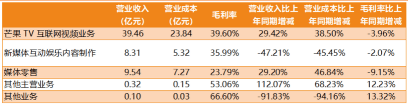 除了为人熟知的芒果TV,芒果超媒还包括媒体零售、新媒体互动娱乐内容制作等其他业务。半年报数据,芒果超媒实现营收57.74亿元,同比增长4.90%;归属于上市公司股东净利润为11.03亿元,同比增长37.30%。其中,芒果TV互联网视频业务上半年贡献营收39.46亿元,占比68.3%。