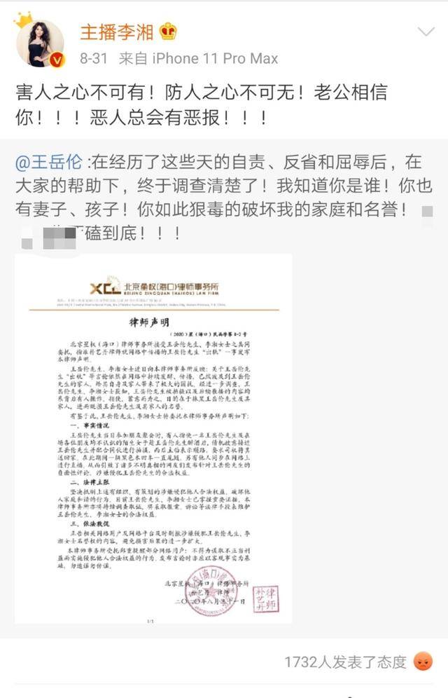 但李湘却难得表了态,她转发了这条声明,并且态度一百八十度大转变,称自己坚决相信王岳伦,还表示恶有恶报。